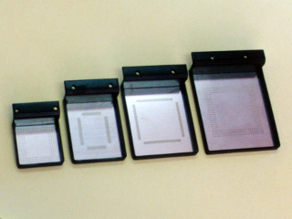 QFPやBGAなどLSI単体のクリームはんだを印刷するための小さなメタルマスクです。